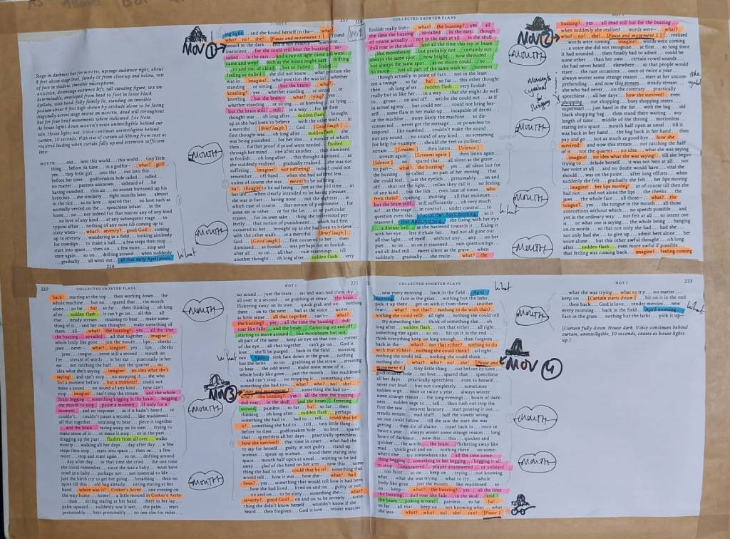 I’m starting to go through personal recordings and find a way of sharing them as an archive on my website, and linking it to my mailout. Here’s an extract of MOUTH, my piece for solo drum kit inspired by Samuel Beckett’s work Not I. You can see the text below and I plan to share more of how I devised the piece soon…